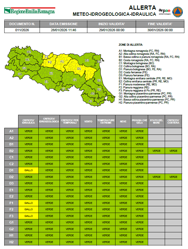 Per giovedì 29 gennaio non sono previsti fenomeni meteorologici significativi ai fini dell’allertamento. La criticità idraulica è riferita alla propagazione delle piene nei tratti vallivi dei corsi d'acqua maggiori. Nelle zone montane e collinari non si escludono occasionali fenomeni franosi sui versanti caratterizzati da condizioni idrogeologiche particolarmente fragili, a seguito delle precipitazioni dei giorni precedenti.