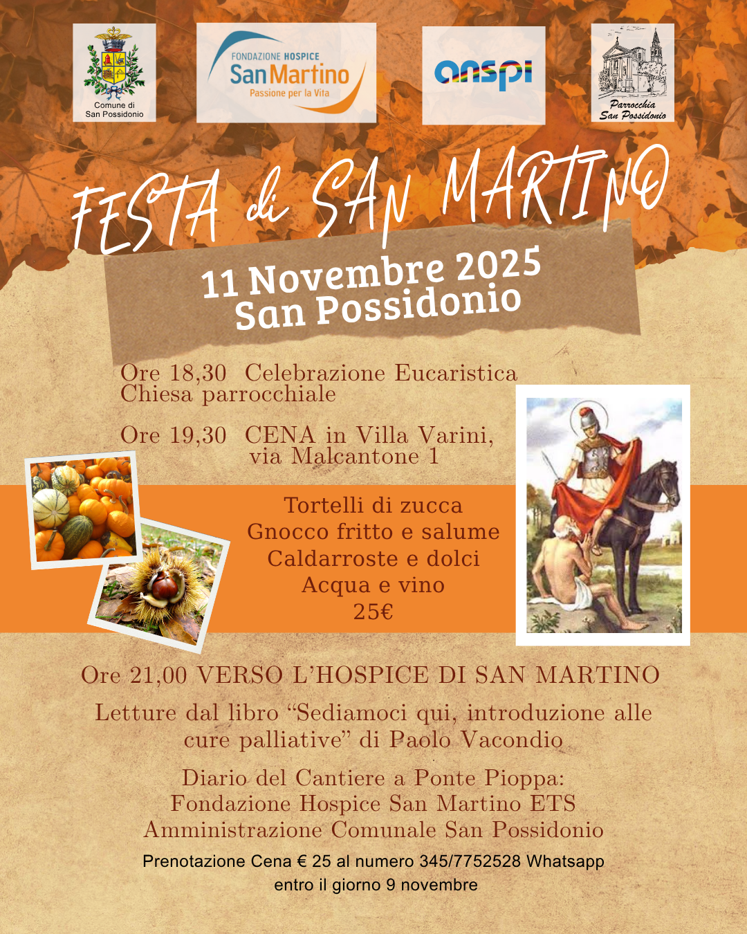 Martedì 11 Novembre il Comune di San Possidonio, in collaborazone con la Fondazione Hospice San Martino ETC, la Parrocchia di San Possidonio e il circolo ANSPI Possidiese organizza una giornata dedicata alla festa di San Martino.