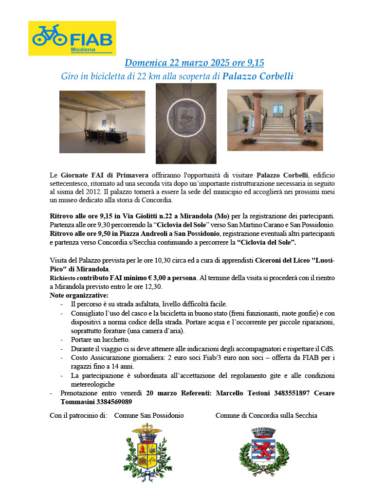In occasione delle Giornate FAI di Primavera, FIAB Modena organizza un’escursione su due ruote dedicata all'arte e alla mobilità sostenibile. Un itinerario di 22 km che ci porterà ad ammirare la rinascita di Palazzo Corbelli, gioiello settecentesco di Concordia sulla Secchia, recentemente restaurato dopo il sisma del 2012.