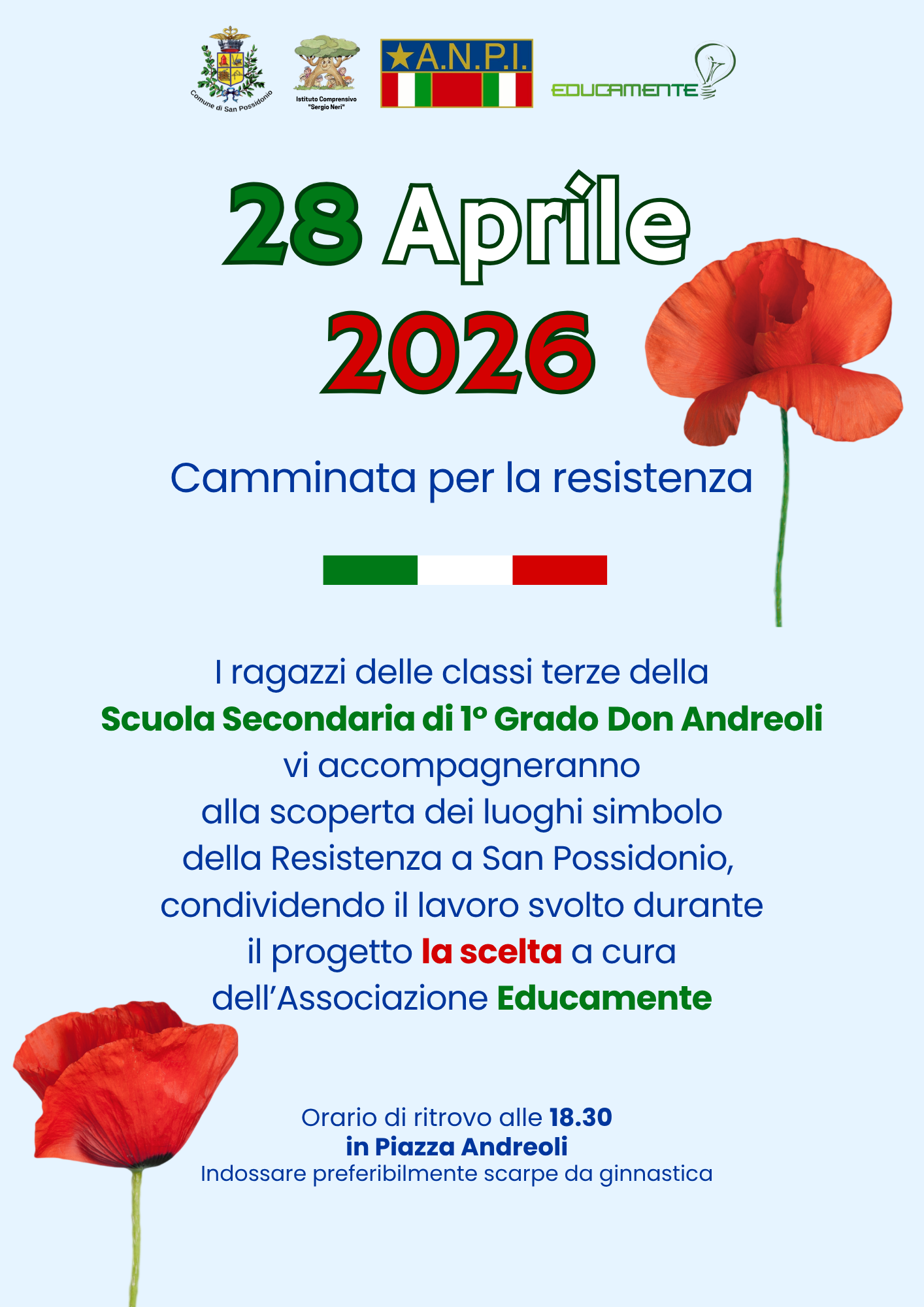 Nell’ambito del progetto è in programma la Camminata della Resistenza, che si terrà il 28 aprile alle ore 18.30. L’iniziativa prevede un percorso attraverso luoghi simbolo del territorio, con l’obiettivo di ricordare eventi significativi della storia locale e nazionale, promuovendo al contempo valori di cittadinanza attiva e impegno civile.